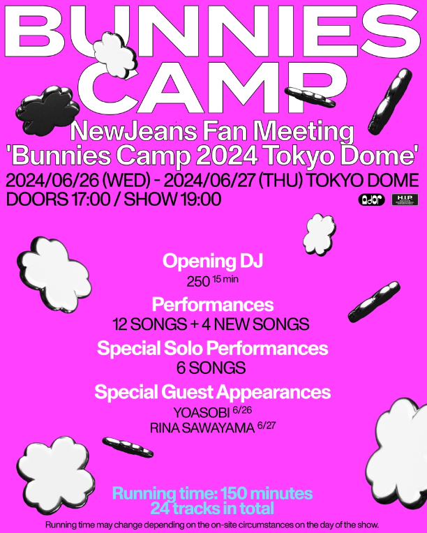 뉴진스는 6월 26~27일 도쿄돔에서 '버니즈 캠프'라는 팬 미팅을 개최합니다. 이 자리에서는 5월과 6월에 공개될 예정인 신곡 4곡 뿐만 아니라, 지금까지 발표한 앨범 3장의 수록곡 전곡과 특별 개인 무대 6곡도 함께 선보입니다.
