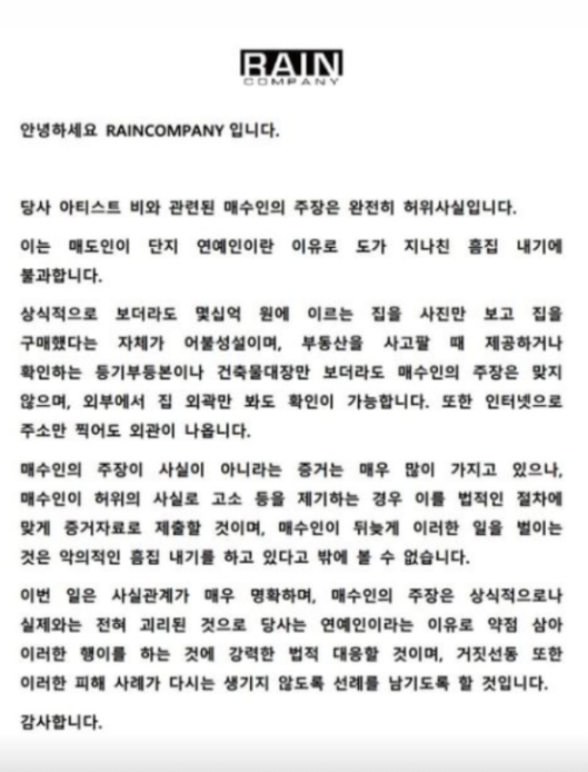 해당 소식이 알려지자 비 소속사 레인컴퍼니는 공식 계정을 통해 입장문을 내고 반박에 나섰다. 소속사 측은 "비와 관련된 매수인의 주장은 완전히 허위사실"이라며 "매도인이 단지 연예인이란 이유로 도가 지나친 흠집 내기에 불과하다"고 주장했다.