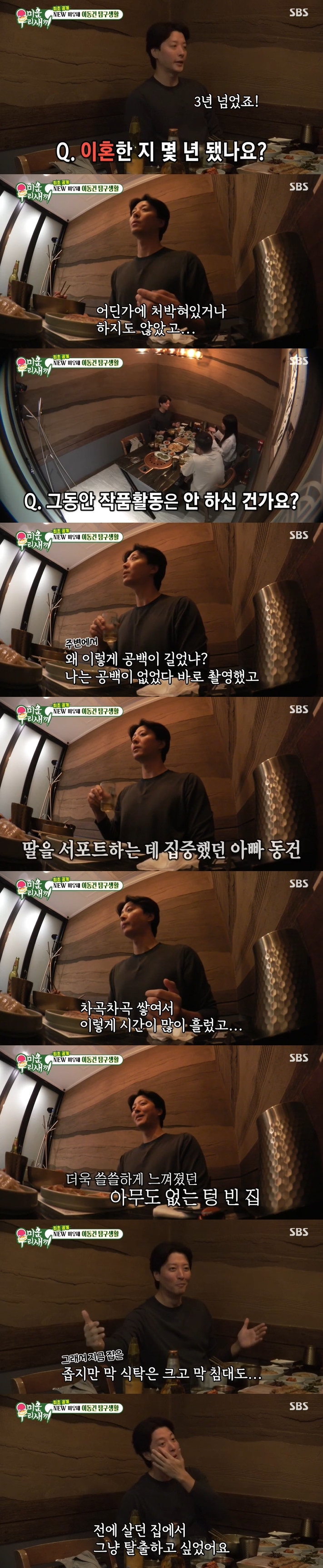 이동건은 이혼 후에 혼자 집에서 살았다고 털어놓았습니다. 이야기하면서 "제가 혼자 살던 집에서 결혼 생활을 시작했고 로아가 태어났다"라고 했고, 이후에 로아와 전처와 나간 집에서 혼자 살게 되었을 때의 감정을 고백했습니다. 그는 집에 들어가기가 어색했고 외출하기 싫었다고 토로했습니다.