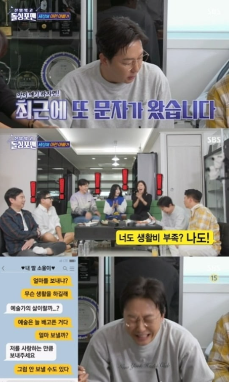 방송에서 탁재훈은 딸이 미국에서 유학 중인데 갑자기 온 문자에 대해 언급했습니다. "얼마 전에 딸 문자가 왔다. 용돈이 떨어졌다고 하더라. 준 지 얼마 안 됐다"라며 탁재훈은 딸의 용돈 요청을 소개했습니다.