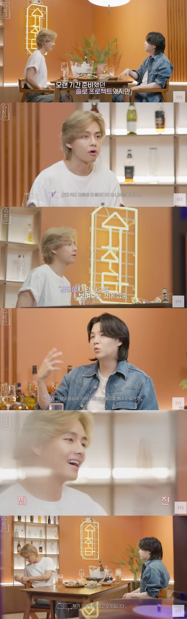 두 사람의 대화 주제는 뷔의 첫 솔로 앨범으로 시작됐다. 슈가는 "내가 알기론 2,3년 전부터 준비를 했는데 드디어 나왔다"라며 반겼다. 뷔는 "딱 3년 정도 된 거 같다"며 쉽지 않았던 작업 과정에 대해 이야기했다.
